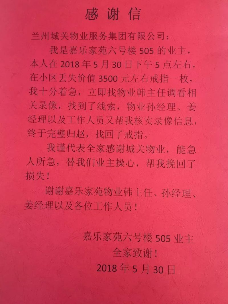 家住嘉樂家苑6號樓505的業(yè)主林女士,不慎將一枚戒指遺失在小區(qū)內(nèi)。丟失了戒指的林女士萬分著急,來到物業(yè)服務(wù)中心尋求幫助。城關(guān)物業(yè)嘉樂家苑項目部經(jīng)理韓元春得知情況后,立刻調(diào)閱查看當天監(jiān)控視頻,經(jīng)過仔細排查后找到了相關(guān)線索,并順利尋回失物,及時挽回了業(yè)主的財產(chǎn)損失?吹浇渲竿觇禋w趙后的李女士感激萬分,特將感謝信送至公司,以此表達對城關(guān)物業(yè)的贊揚。