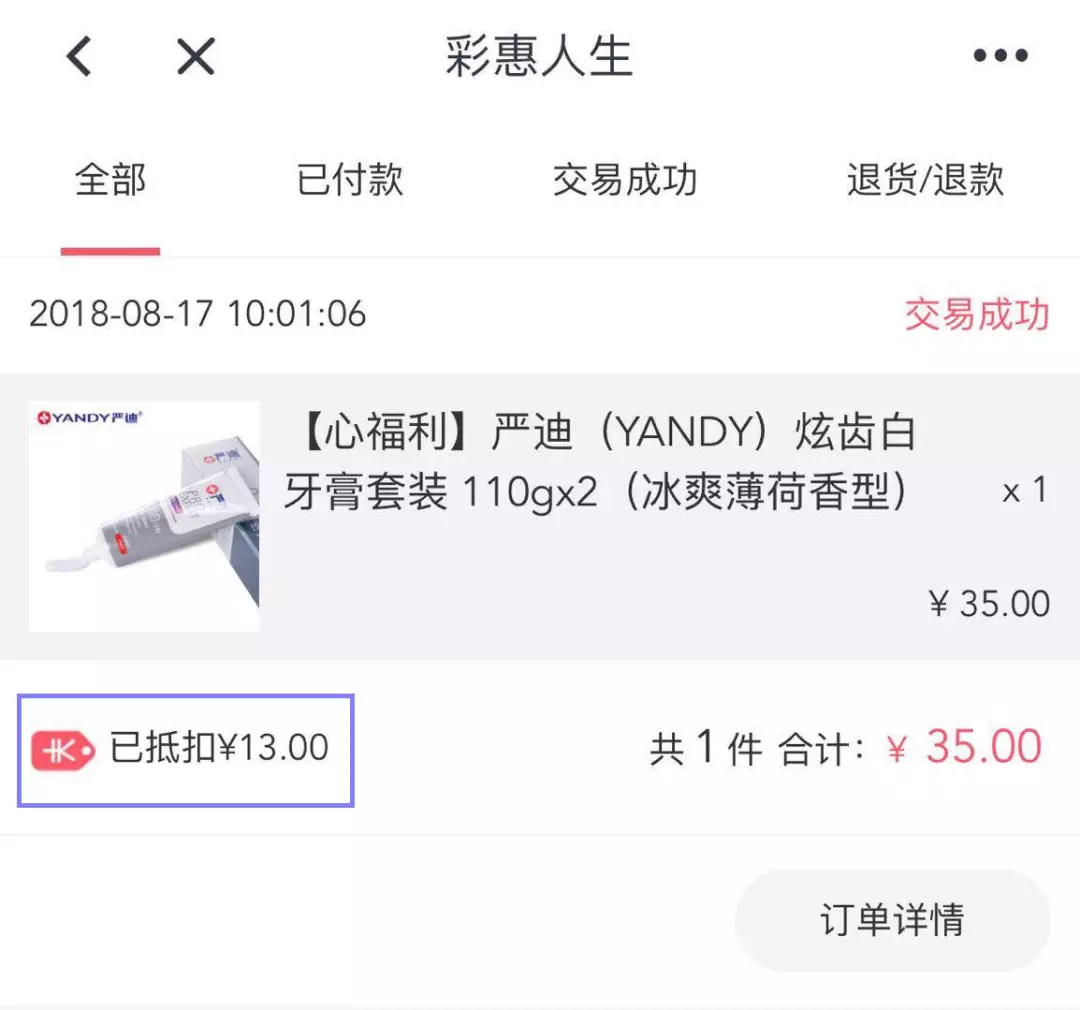訂單支付成功后,支付成功頁面會顯示購物金額及最新的抵扣物業(yè)費信息。