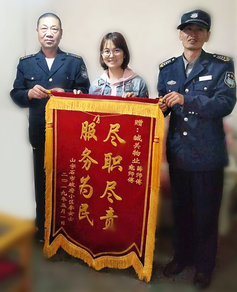 經(jīng)過半個月的排查,寇懷彥和薛叔杰最終確定領(lǐng)取人是旁邊小區(qū)的住戶,經(jīng)過登門協(xié)調(diào)溝通,快遞于5月1日找回并完璧歸還,交由李女士手中。當(dāng)李女士接過快遞,十分激動,“本以為我的快遞找不回來了,多虧你們的幫助,太謝謝你們了!”李女士為表感謝,特制作錦旗送至山字石家屬院的門崗處。寇懷彥和薛叔杰接過錦旗,喜笑顏開,他們表示:自己早就把山字石家屬院當(dāng)成自己的家了,照看好家園、守護好家人是自己的職責(zé),家人的東西丟了,我們幫忙去找,也是理所應(yīng)當(dāng)?shù)氖拢?/span>