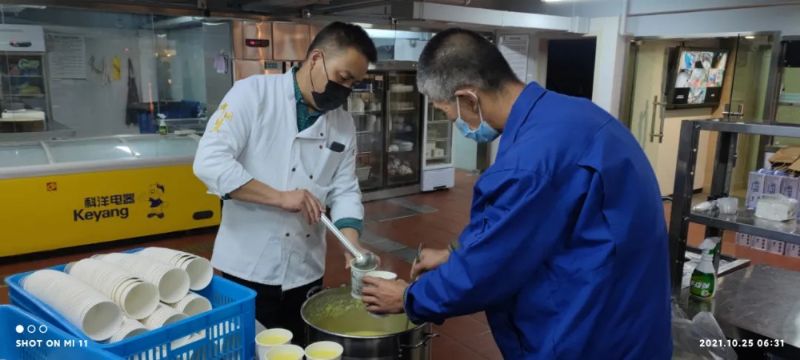 為了確保餐飲能夠及時(shí)送達(dá)各防疫點(diǎn),城關(guān)物業(yè)董事長(zhǎng)楊民召從早上5:30開始就帶領(lǐng)大家在配餐間忙碌起來。他一邊配餐,一邊不停地看時(shí)間,只為確保防疫一線的工作人員吃上熱乎可口的飯菜。他說到,“我們的愛心餐要一直送下去,絕對(duì)不能讓辛苦在防疫一線的工作人員在吃飯上有后顧之憂。”