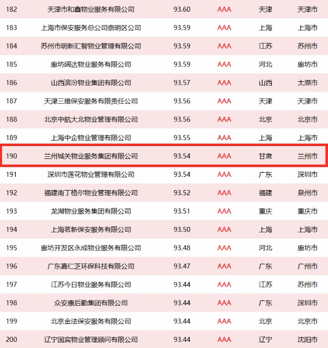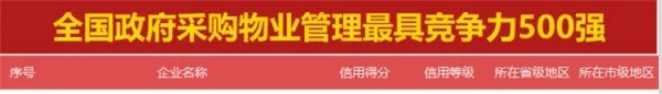 3月12日,政府采購大數(shù)據(jù)研究院和政府采購大數(shù)據(jù)網(wǎng)聯(lián)合發(fā)布了全國政府采購物業(yè)管理服務最具競爭力500強,城關物業(yè)憑著過往良好的履約情況和風險管控能力成功入選,以93.54分的信用得分榮獲第190名,成為甘肅省唯一入選前500強的企業(yè)。